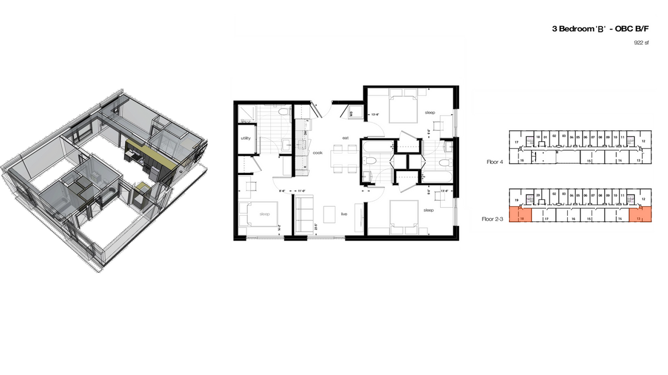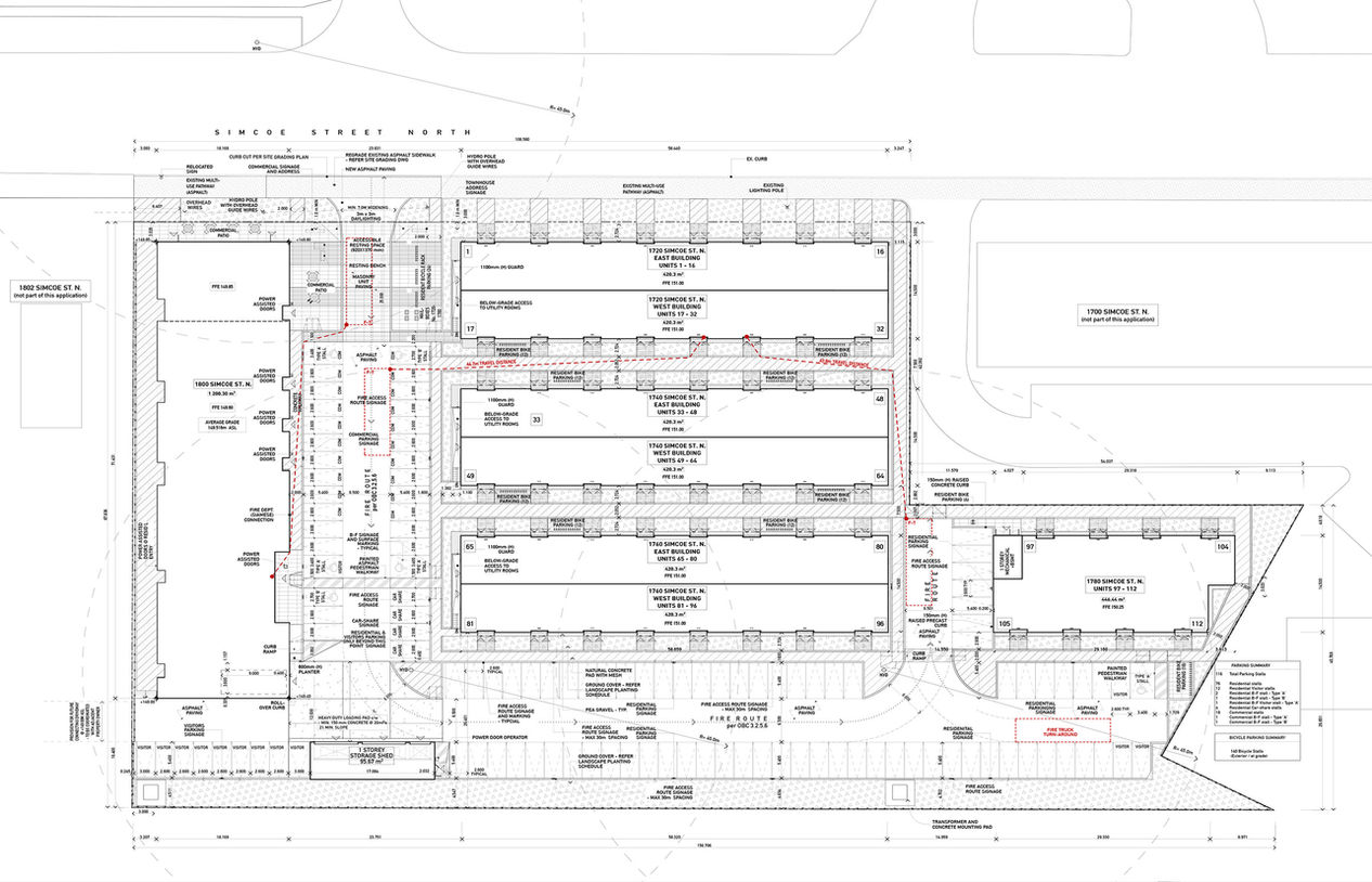 Comprised of 112 stacked townhouse units and 58 apartments, 80% of suites are 3-bedroom units. The midrise building is designed to meet the Oshawa Accessibility Design Standards (OADA). The project uses wood-frame construction in both the townhouses and the midrise block.