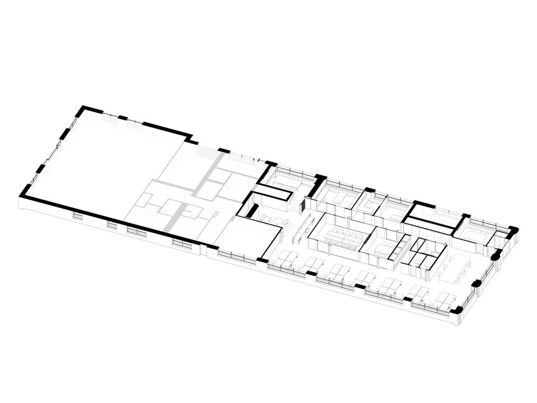This is a commerical renovation of ground floor suite in former mattress factory for a growing real estate developer. The layout of the 5,000 SF suite provide for open concept work spaces and a around an island of meeting rooms with full height glazing.